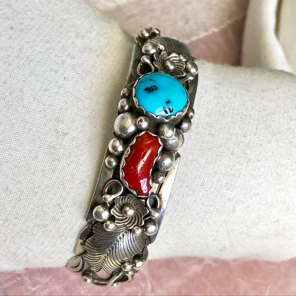 Sunwest Jewelry Navajo Stamped Turquoise And Coral Cuff